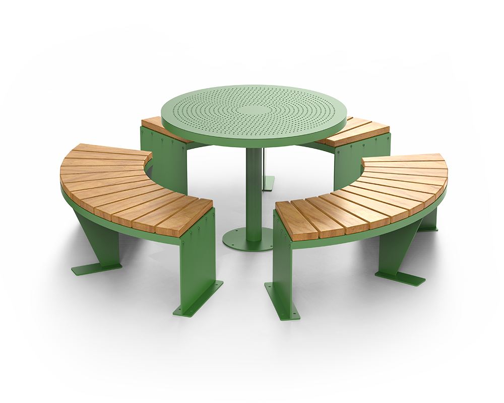 Scandik piknikulaud koos Domino pinkidega. Karboniseeritud terasest, tsingitud ja roheliseks värvitud.